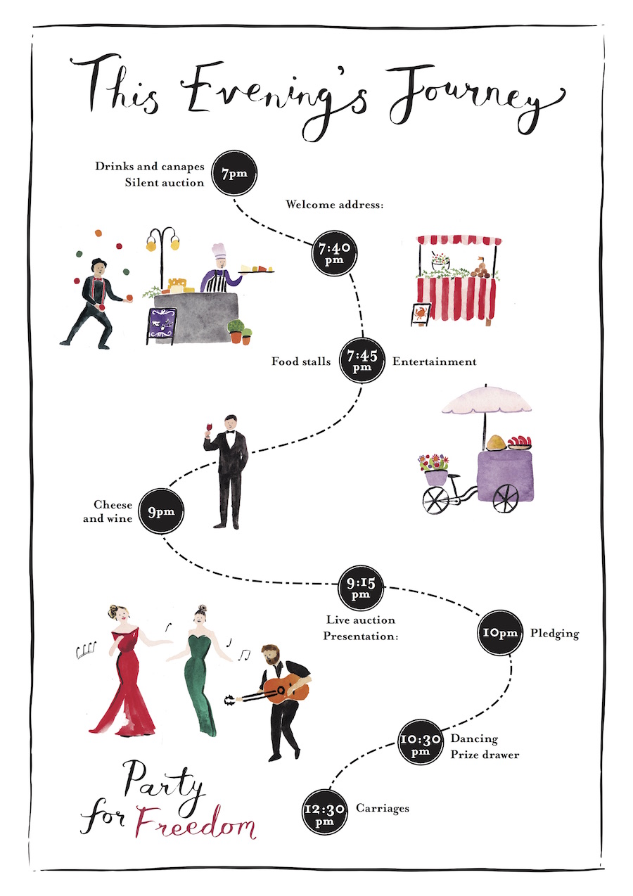 Illustration and graphic design for an international NGO, used at their Annual Party celebration. This included an invitation, event booklet, A1 running order map, menu, seating plan and certificates with illustrative elements throughout.